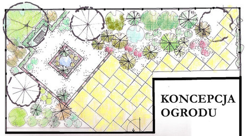 Prezentowany przykład niewielkiego ogrodu przeistoczono w salon ogrodowy. Kompozycję oparto na geometrycznych formach. Układ linii o innym kącie niż linia ogrodzenia powiększył optycznie niewielką przestrzeń. Wydzielono patio z kamiennych płyt na meble wypoczynkowe, żwirową nawierzchnię z małą fontanną w centrum, miejsce na ławkę bujaną pod niewielkim drzewem, otoczoną niskim żywopłotem bukszpanowym. Jako kolor „łamiący” piaskowe płyty i biały żwir zastosowano czerwone linie bruku klinkierowego.