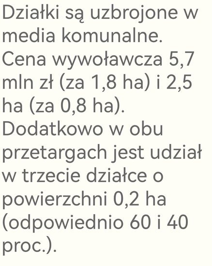 Zgodnie z planem zagospodarowania przestrzennego tej części Elbląga jest ona przeznaczona pod zabudowę usługową. Działki są uzbrojone w media komunalne. Cena wywoławcza 5,7 mln zł (za 1,8 ha) i 2,5 mln zł (za 0,8 ha). Dodatkowo w obu przetargach jest udział w trzecie działce o powierzchni 0,2 ha (odpowiednio 60 i 40 proc.).