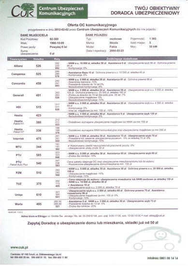 W Elblągu otworzono nowy odział CUK Centrum Ubezpieczeń Komunikacyjnych. Zakup ubezpieczenia samochodu jeszcze nigdy nie był tak prosty i szybki. W zaledwie kilka minut, na miejscu w oddziale, otrzymamy symulację cen polis z 20 wiodących na rynku Towarzystw Ubezpieczeniowych. Dla bardziej zabieganych, CUK oferuje telefoniczne konsultacje. Warto porównać ceny polis dostępnych na rynku, bo może okazać się, że do tej pory przepłacaliśmy i to słono za nasze ubezpieczenie.