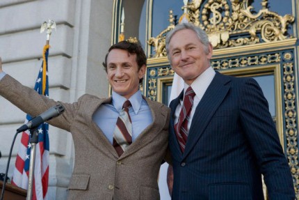 Kadr z filmu „Slumdog. Milioner z ulicy”, a poniżej „Obywatel Milk”.