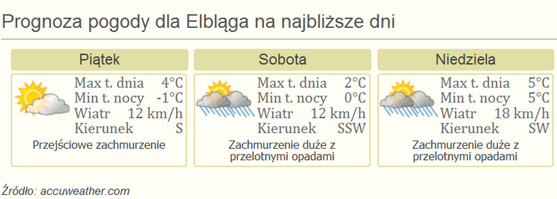 Wygląda na to, że w ten weekend pogoda niestety nie dopisze... Chociaż nadal jest dość ciepło (w niedzielę do 5 stopni), to na weekend zapowiadane jest zachmurzenie duże z przelotnymi opadami. Pamiętajcie jednak, że to prognoza - jeśli liczycie na poprawę pogody - możecie sprawdzać ją na bieżąco, zaglądając tutaj.