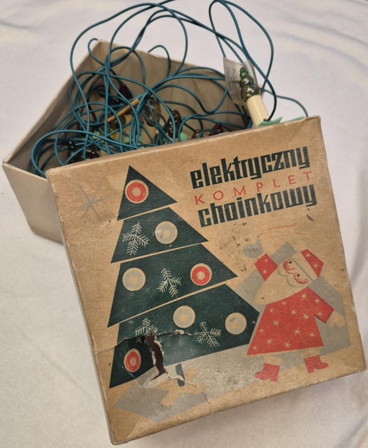 Trudno wyobrazić sobie Święta bez choinki i ozdób, dlatego pragniemy pochwalić się dekoracjami, które ostatnio trafiły do kolekcji PRL. Prezentujemy zestaw lampek opisany jako „elektryczny komplet choinkowy” z lat 60. wyprodukowany przez Spółdzielnię Inwalidów im. H. Sawickiej w Łodzi. Żaróweczki mają różne kształty, co wskazuje na intensywne użytkowanie oraz naprawy. Na odwrocie pudełka znajduje się informacja, że lampki „zostały sprawdzone pod względem bezpieczeństwa użytkowania”, jednak nie odważyliśmy się przetestować, czy nadal działają. Z pewnością elektryczne lampki były bezpieczniejsze od wciąż chętnie używanych prawdziwych świeczek, zwłaszcza znajdujących się blisko dekoracji z waty. W okresie PRL popularność zaczęły zyskiwać sztuczne choinki, które w niewielkim stopniu przypominały żywe drzewko, posiadały jednak walory praktyczne.