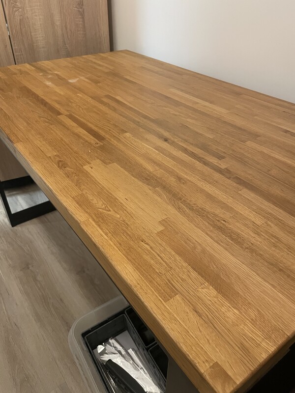 Materiał blatu to dąb. W jednym miejscu jest przebarwienie (to nie jest dziura), które można wywabić.