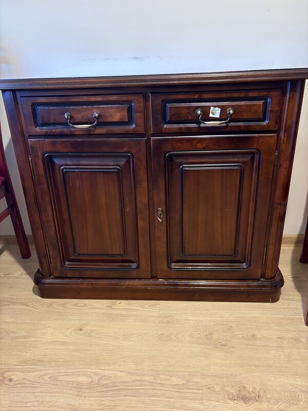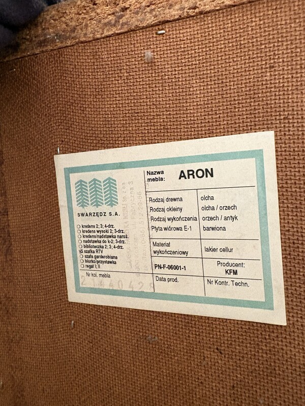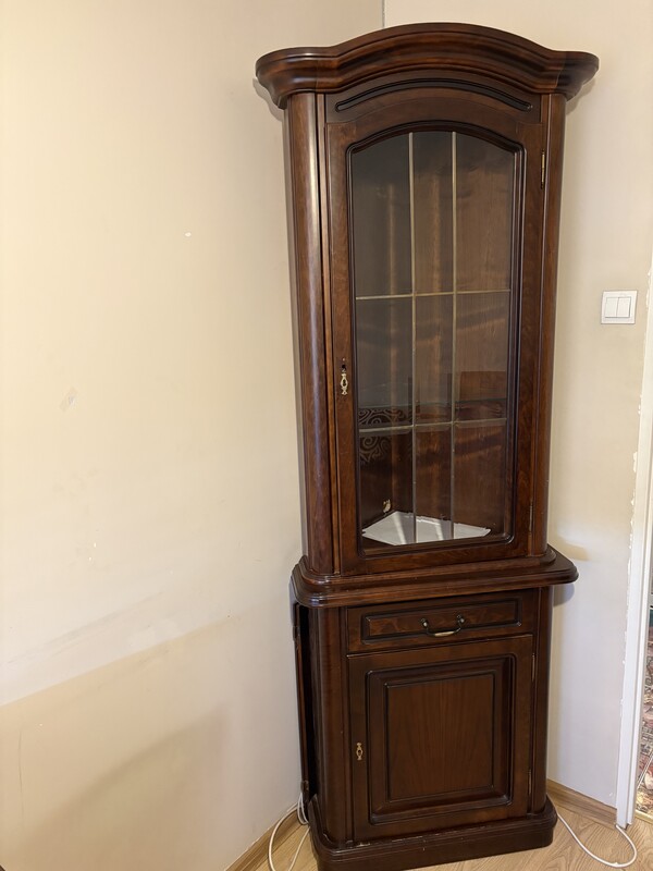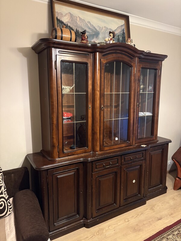 Meble nie są w stanie idealnym. Widać ślady użytkowania, delikatne otarcia lakieru widoczne na zdjeciach. Brakuje trzech osłon na zamki w szafkach pod witryną.