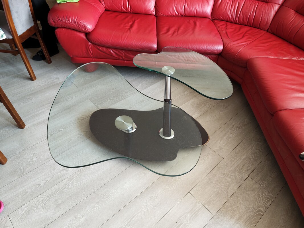 Mechanizm: Górne tafle szkła są osadzone na obrotowych ramionach, co pozwala na zmianę konfiguracji stolika (można go "rozłożyć" lub złożyć, by zajmował mniej miejsca).