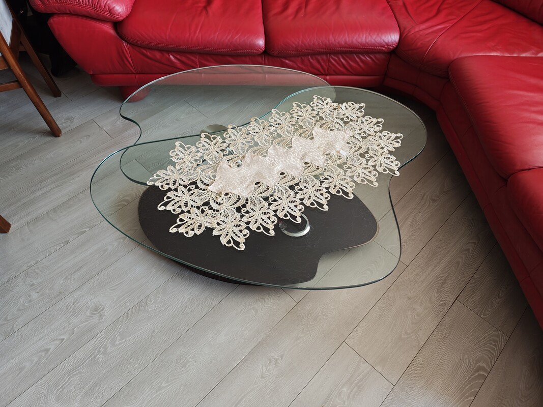 Mebel wyróżnia się nieregularnym, organicznym kształtem szklanych blatów oraz solidną konstrukcją.