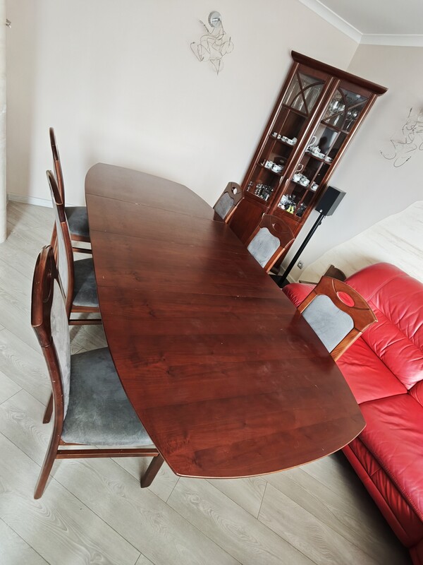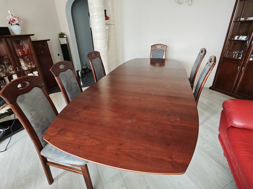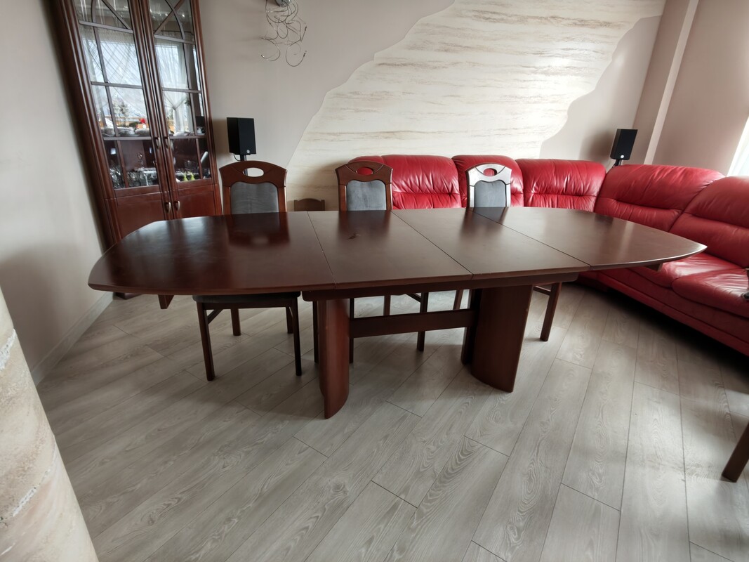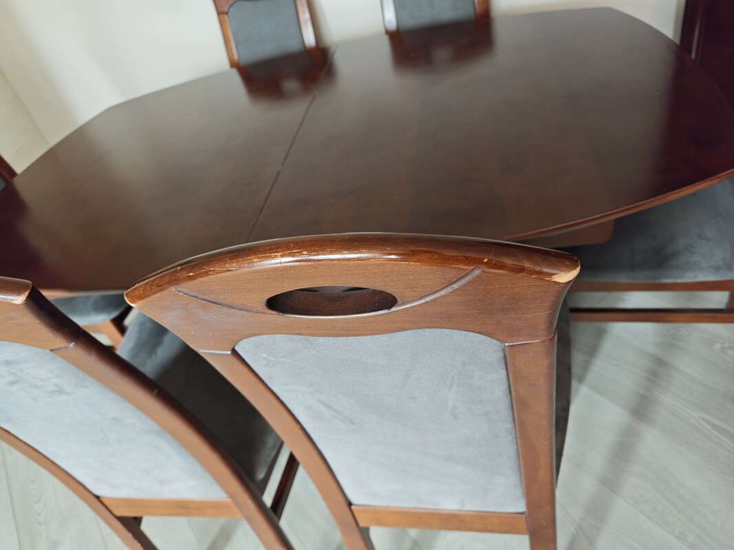 Solidny, drewniany zestaw w klasycznym stylu. Idealny do jadalni lub salonu. Stół rozkładany, dzięki czemu sprawdzi się zarówno na co dzień, jak i przy większej liczbie gości.