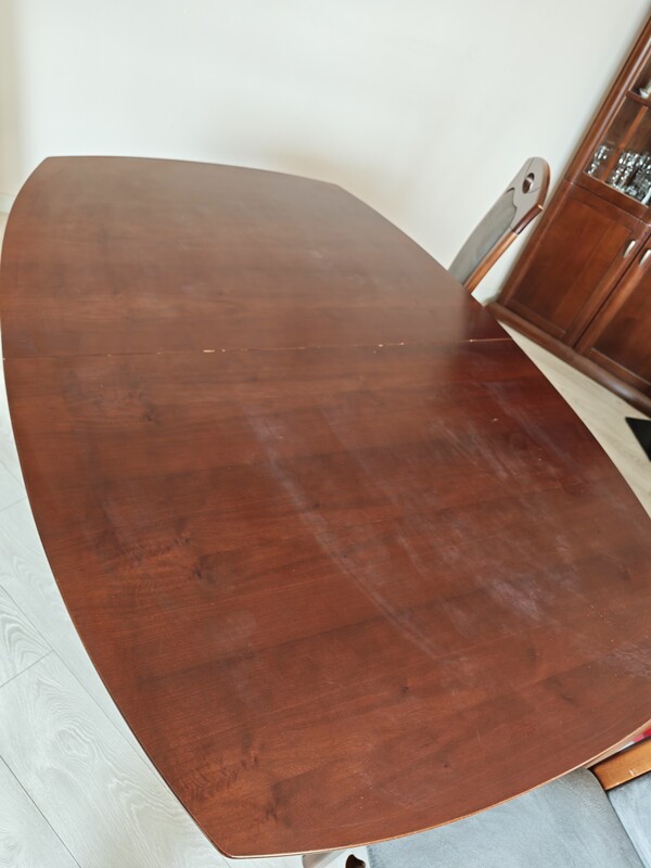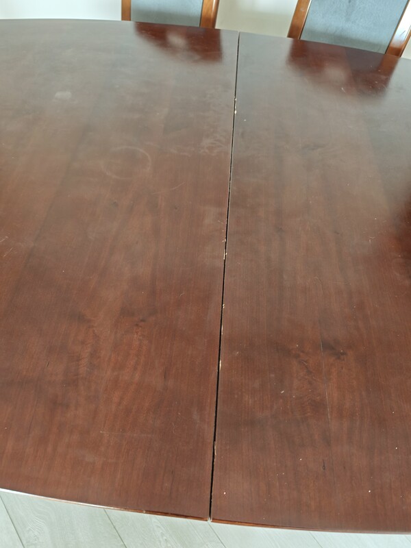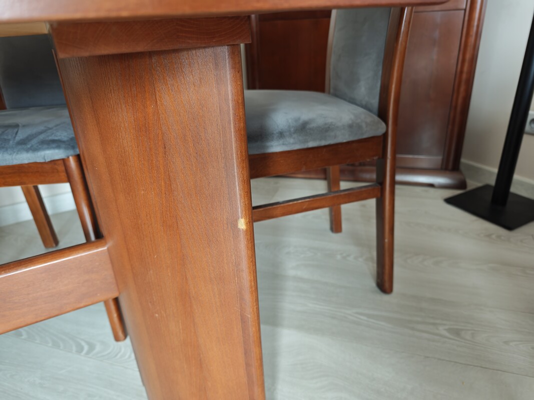 Stan: Mebel używany, w pełni funkcjonalny. Widoczne normalne ślady użytkowania oraz lekkie przebarwienia na blacie. Krzesła stabilne, wygodne.
