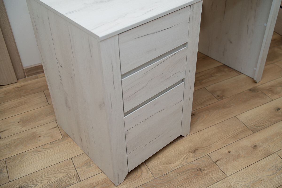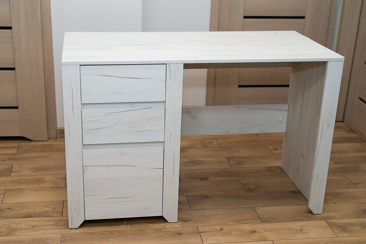 Biurko posiada trzy pojemne szuflady oraz dużą, wygodną powierzchnię roboczą. Konstrukcja jest stabilna, wykonana z trwałej płyty laminowanej, łatwej w utrzymaniu czystości.