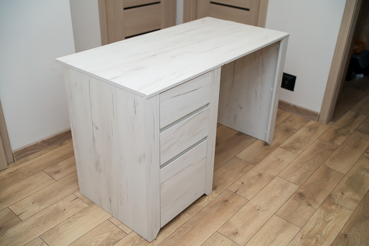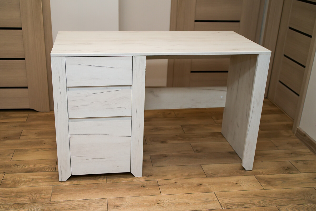 Biurko posiada trzy pojemne szuflady oraz dużą, wygodną powierzchnię roboczą. Konstrukcja jest stabilna, wykonana z trwałej płyty laminowanej, łatwej w utrzymaniu czystości.