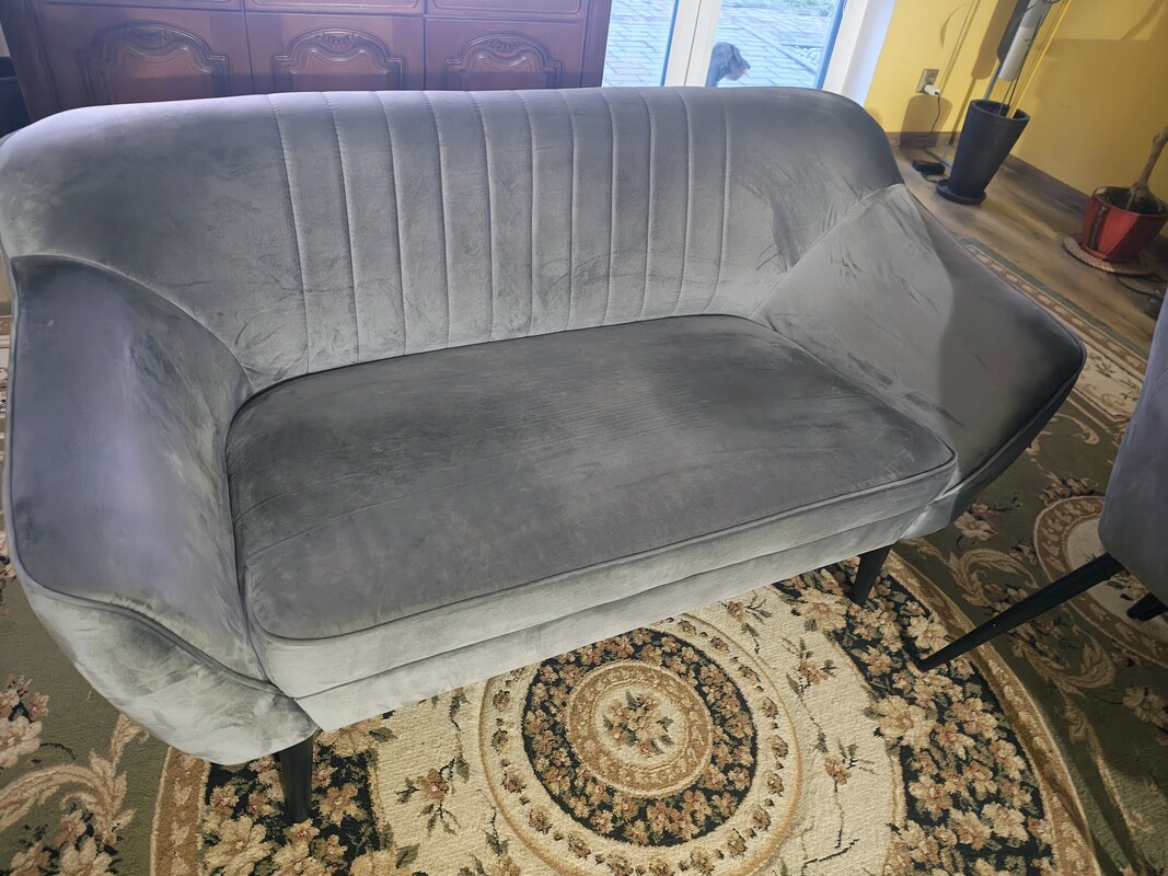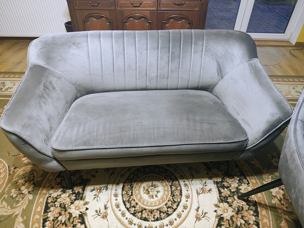 Sprzedam zestaw mebli, kupiony 11 miesięcy temu za 2900 zł (mam potwierdzenie zakupu). Meble były praktycznie nieużywane. Nie mają absolutnie żadnych śladów użytkowania, są jak NOWE. Meble obite są wysokiej jakości welurem w kolorze szarym, nadając im nietuzinkowy wygląd. Dzięki temu estetyczne przeszycia i piękne wzory sprawiają, że są one produktem Premium również pod względem designu.