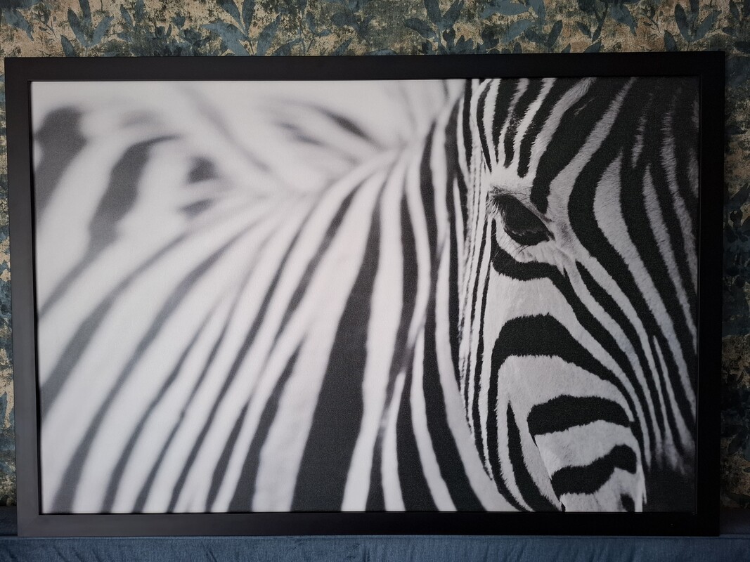 3.Obraz zebry na płótnie kupiony w IKEA i oprawiony w drewnianą ramę w zakładzie szklarskim MIŚ o wymiarach: 85x125.Stan idealny. Cena: 250 zł.