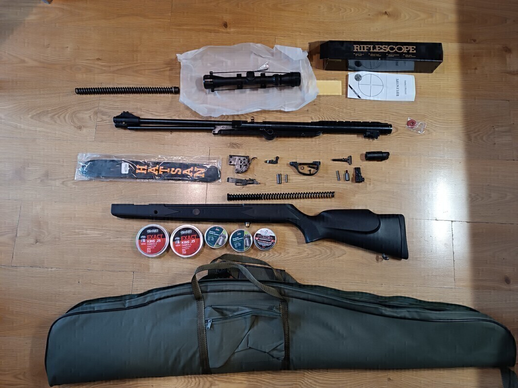 Od zakupu, z wiatrówki zostały wystrzelone tylko 4 śruty, po czym została rozebrana do możliwosci wymiany sprężyny i w takiej formie ją sprzedaję. Trzeba ją samodzielnie złożyć.