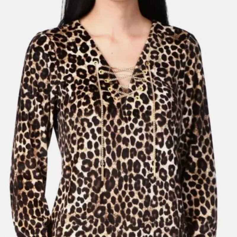 Z przodu złoty łańcuszek z logowanymi końcówkami.