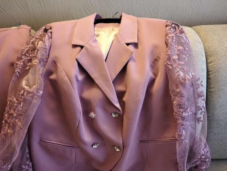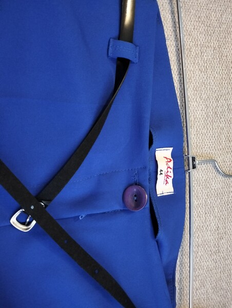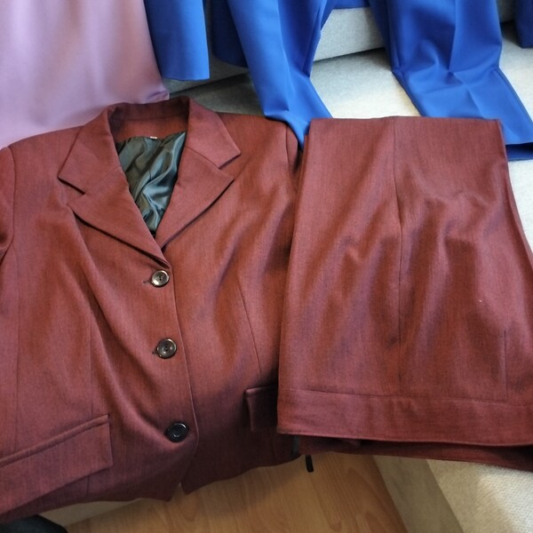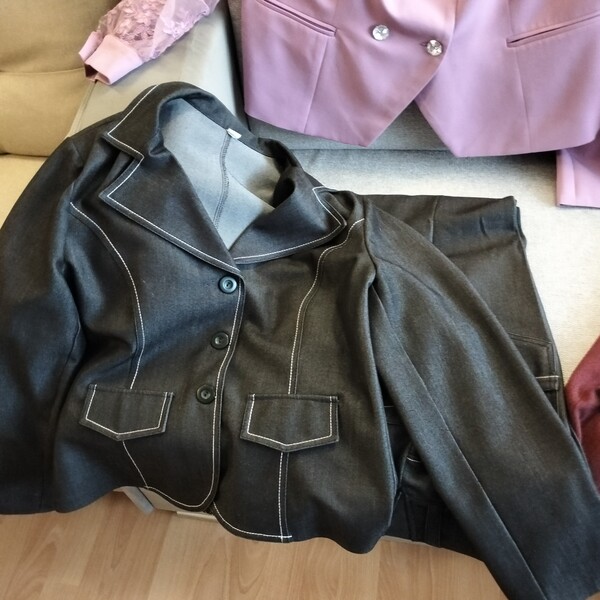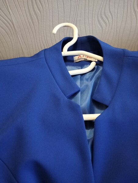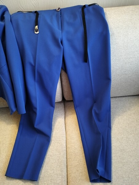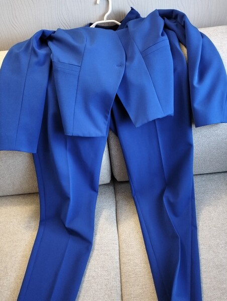 Również komplet niebieski ze spodniami i marynarką oraz białą bluzką.