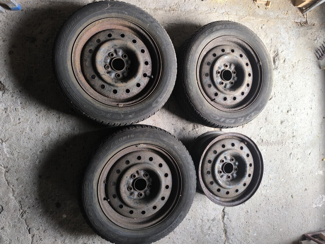 Mam do sprzedania 4szt felg stalowych wraz z oponami zimowymi. (Brak jednej opony). Rozmiar felgi:R16 Rozstaw śrub: 5x114,3 Otwór centralny: 66,1 mm Koła jeździły w Renault Laguna 3 r.2008 Opony rozmiar 205/60R16 Stan felg i opon jak na zdjęciach. Dodatkowo śruby do felg na klucz M14x1,5 klucz 17 w razie pytań proszę o kontakt 607698255