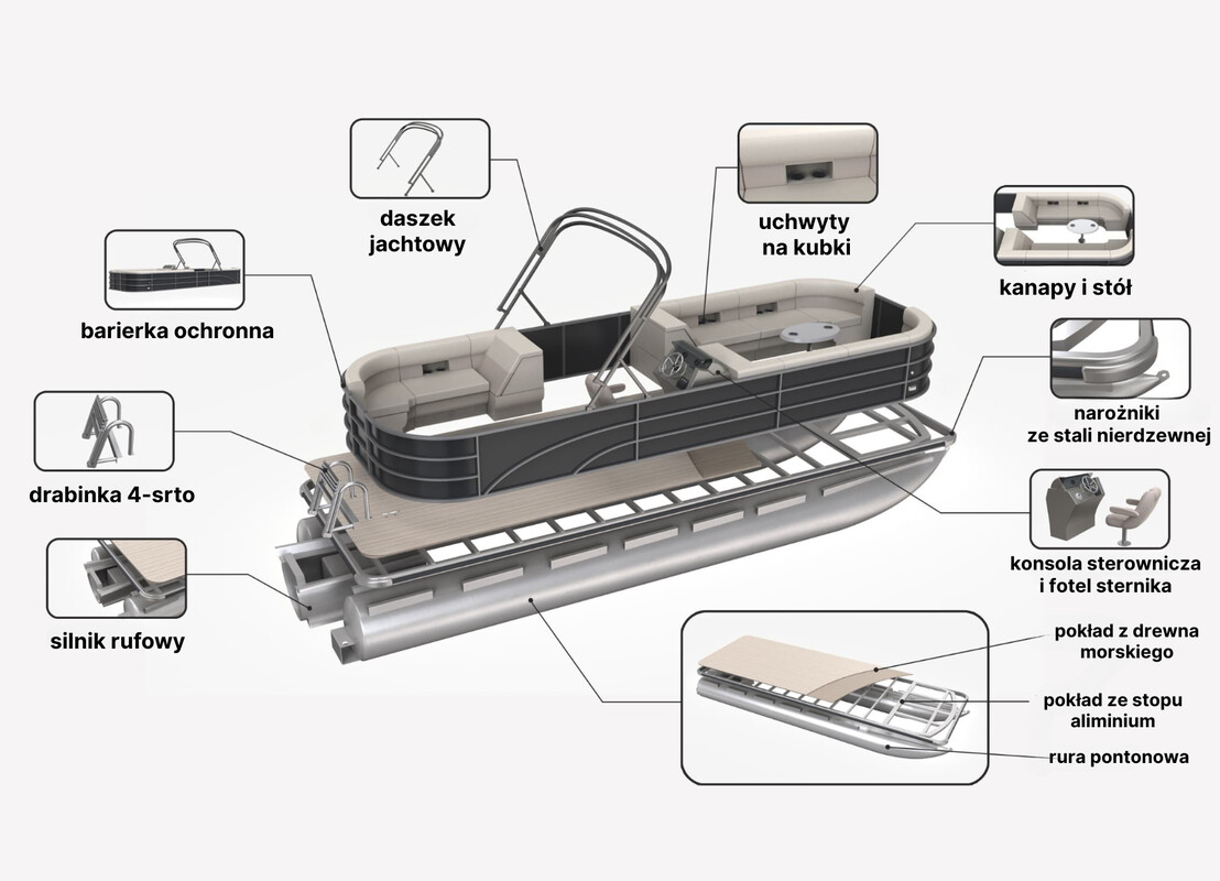 - Dostosowanie układu mebli i funkcjonalności – np. miejsce na chłodziarkę, system audio, miejsce do opalania, czy montaż stolików barowych