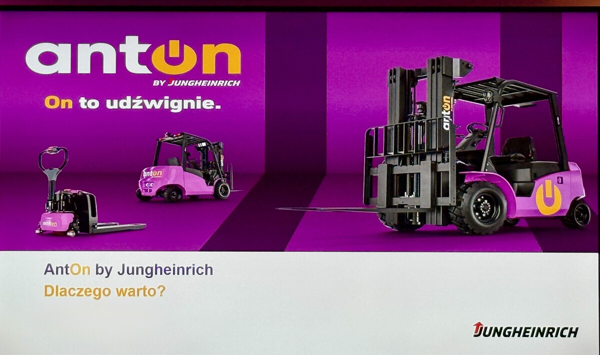 Firma TECHTRANS przedstawia akumulatorowy wózek paletowy AntOn by Jungheinrich, wyposażony w silnik jazdy oraz podnoszenia.