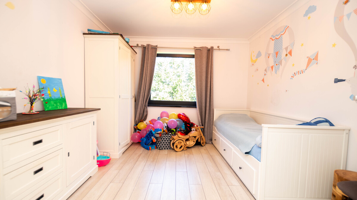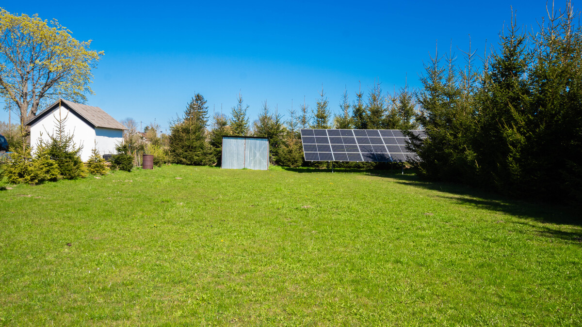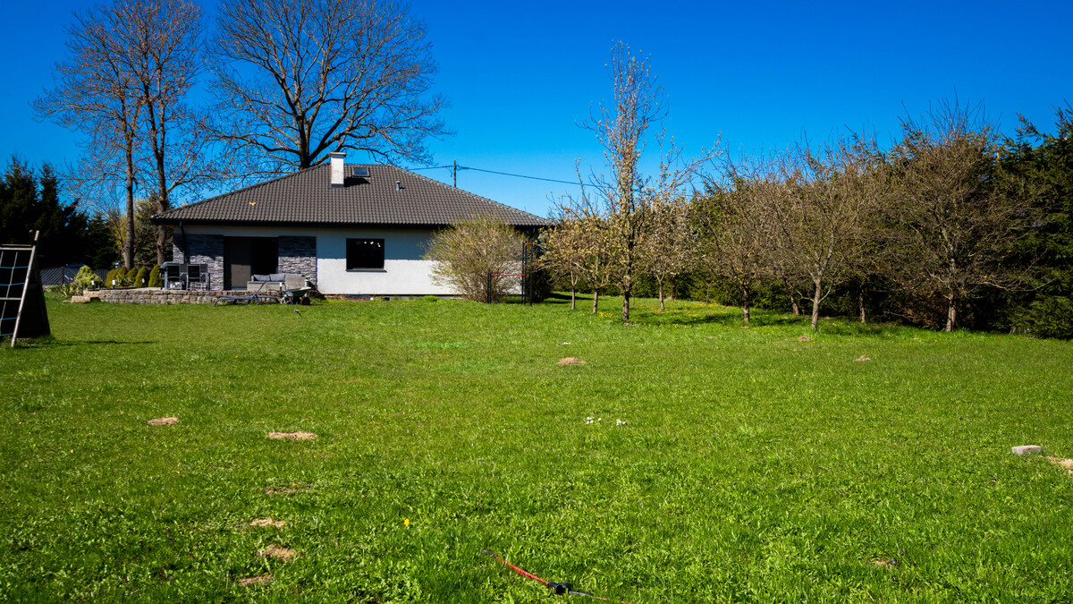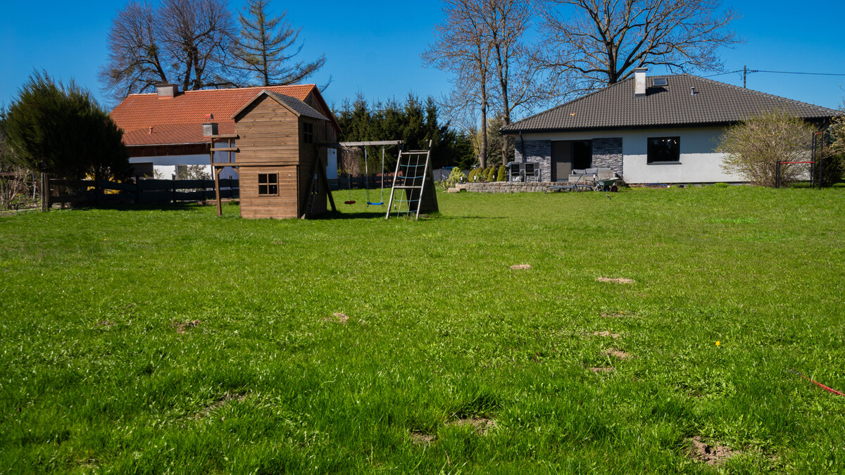 Duża działka została starannie zagospodarowana i ogrodzona. Znajdują się na niej liczne nasadzenia drzew owocowych, takich jak jabłonie, grusze, śliwy, czereśnie i wiśnie, a także krzewy malin i porzeczek, co nadaje temu miejscu wyjątkowy, naturalny charakter. Na posesji przygotowano również przestrzeń rekreacyjną dla dzieci, a całość uzupełnia kamienny podjazd oraz brama wjazdowa. Dla bezpieczeństwa mieszkańców zainstalowano monitoring z pięcioma kamerami oraz system alarmowy. Nieruchomość posiada dostęp do sieci wodociągowej i elektroenergetycznej, a na jej terenie znajduje się własne szambo z odsączeniem, opróżniane średnio raz w roku.