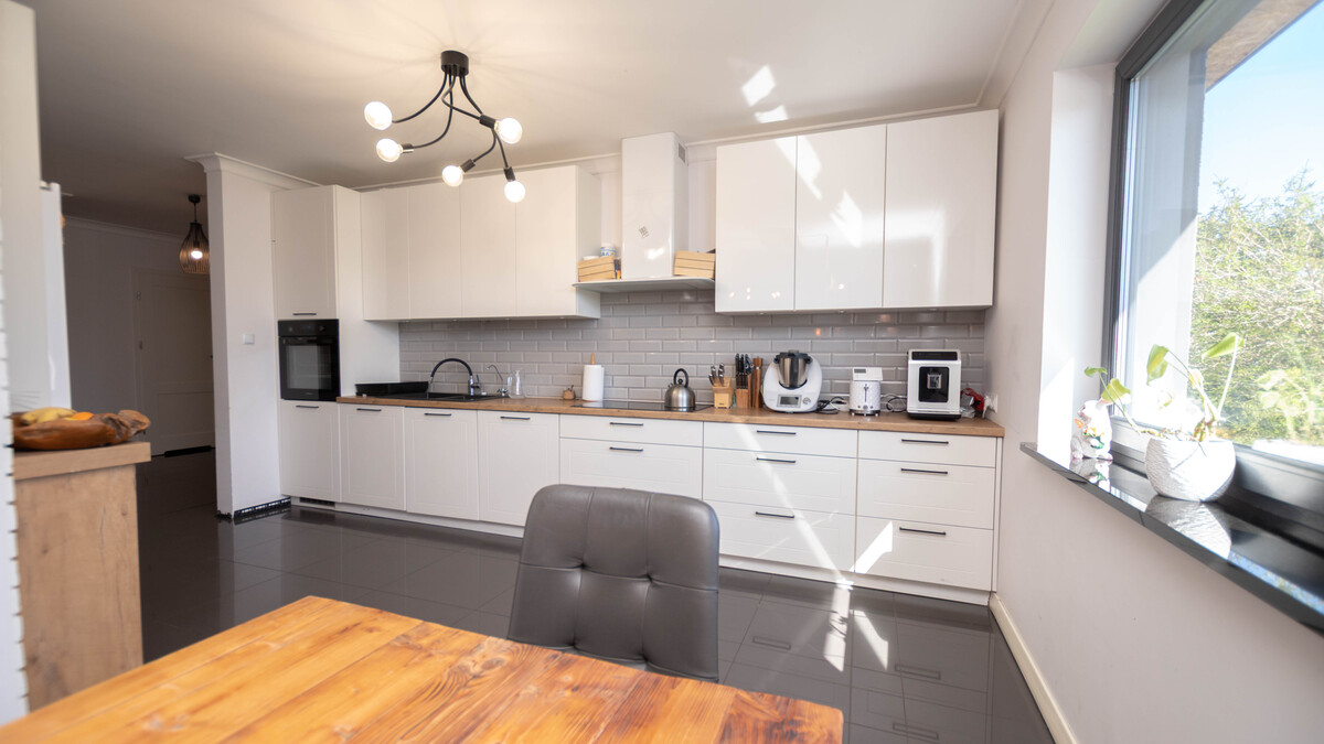 i przestronny salon połączony z nowoczesną, otwartą kuchnią, która została wyposażona w zabudowę oraz wysokiej klasy sprzęt AGD, w tym piekarnik, płytę indukcyjną, zmywarkę oraz dwudrzwiową lodówkę z dystrybutorem lodu. Wnętrze uzupełniają trzy ustawne sypialnie, łazienka z WC oraz dodatkowa toaleta, co zapewnia wygodę dla całej rodziny. Z salonu prowadzi wyjście na taras, który stanowi idealne miejsce do wypoczynku. Dodatkowym atutem jest poddasze z zaprojektowaną otwartą przestrzenią, dającą możliwość aranżacji kolejnego pokoju według własnych potrzeb.