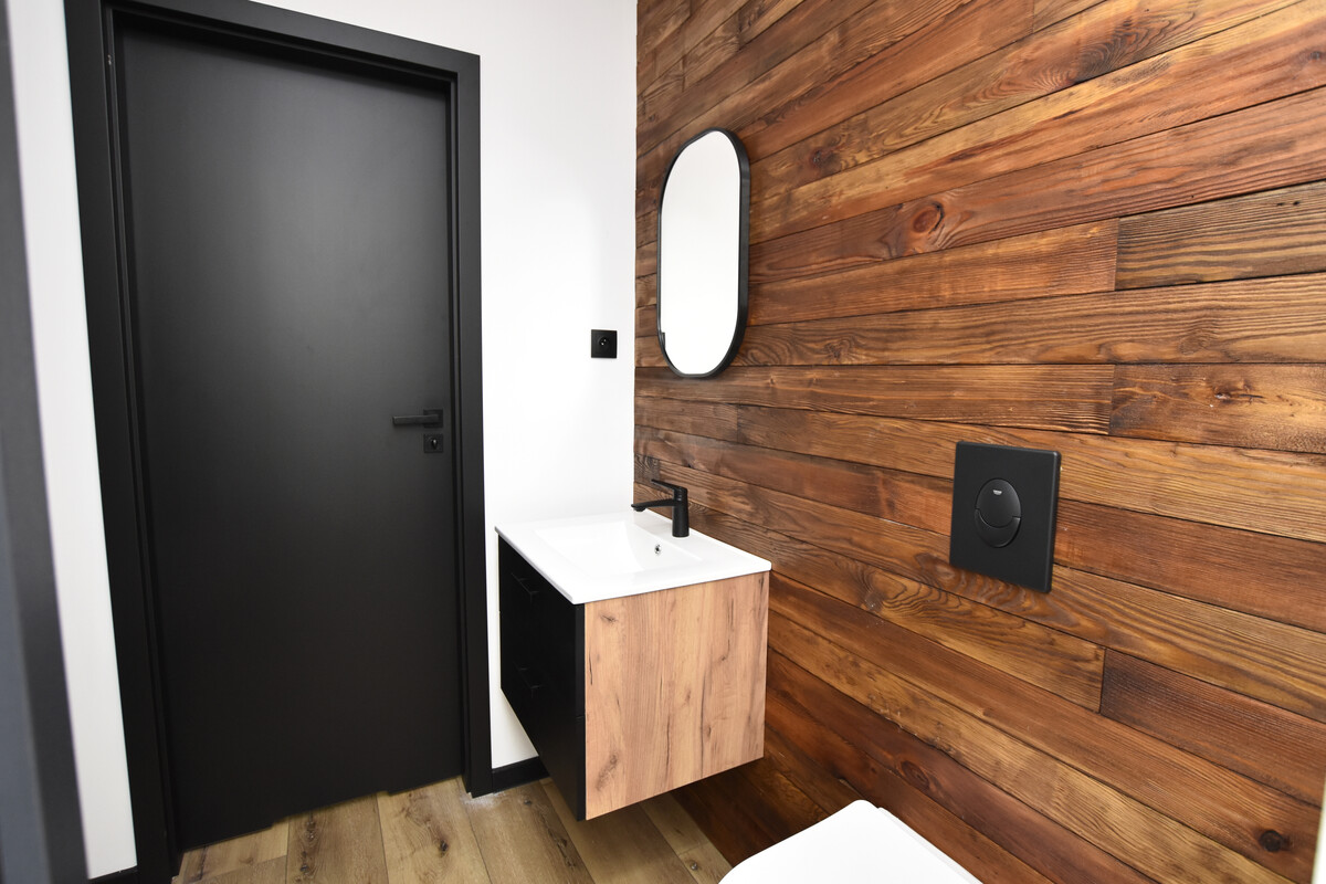 - Wnętrza: płyta GK malowana + ozdobne deski elewacyjne