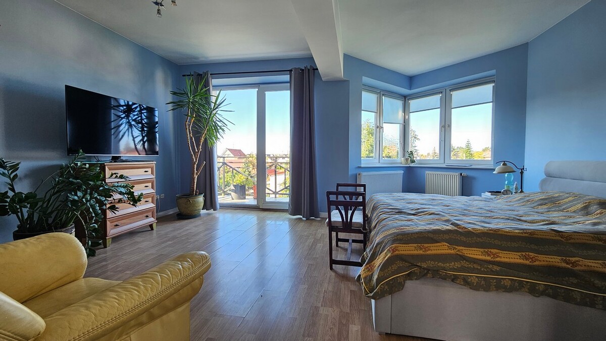 Na drugim piętrze sypialnia z wyjściem na balkon, 2 oddzielne pokoje z dodatkowymi pomieszczeniami, w tym jeden z wejściem na balkon, holl i łazienka rodzinna /prysznic, wanna, WC/.