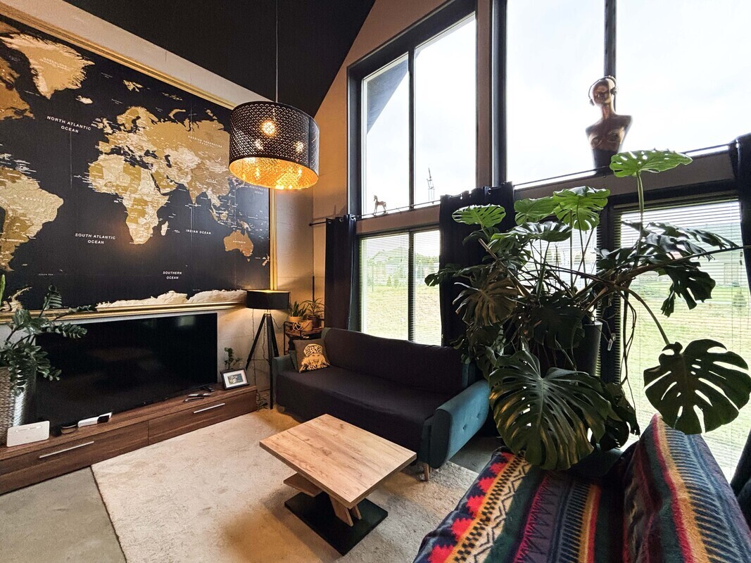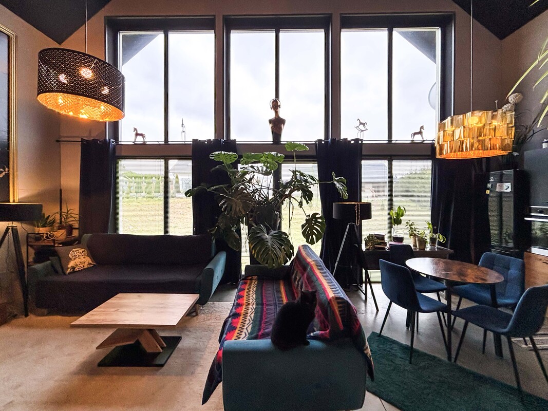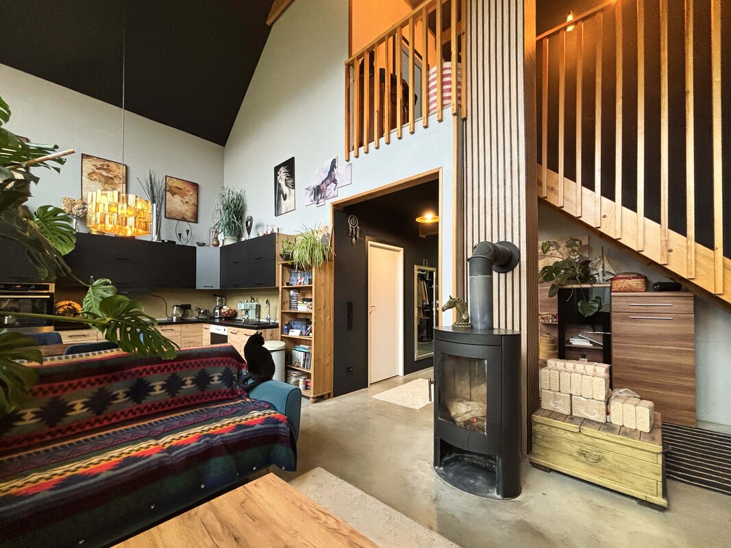 Na parterze znajduje się przestronny salon połączony z kuchnią i jadalnią, łazienka, sypialnia, pomieszczenie gospodarcze oraz hol. Piętro stanowi antresola z pięknym widokiem na przestrzeń dzienną dzięki dużym przeszkleniom, dwa pokoje z wyjściem na duży balkon z widokiem na łąki oraz łazienka. Dodatkowo w holu znajduje się wejście na strych z chowanymi schodami. Dom został zaprojektowany z myślą o komforcie, w części dziennej znajduje się kominek typu „ koza” , a ogrzewanie podłogowe na parterze i piętrze zasilane jest gazowym piecem dwufunkcyjnym z bojlerem. Nieruchomość posiada przydomową oczyszczalnię ścieków, co dodatkowo obniża koszty eksploatacji.