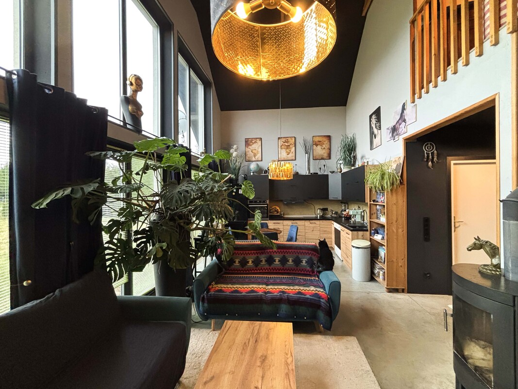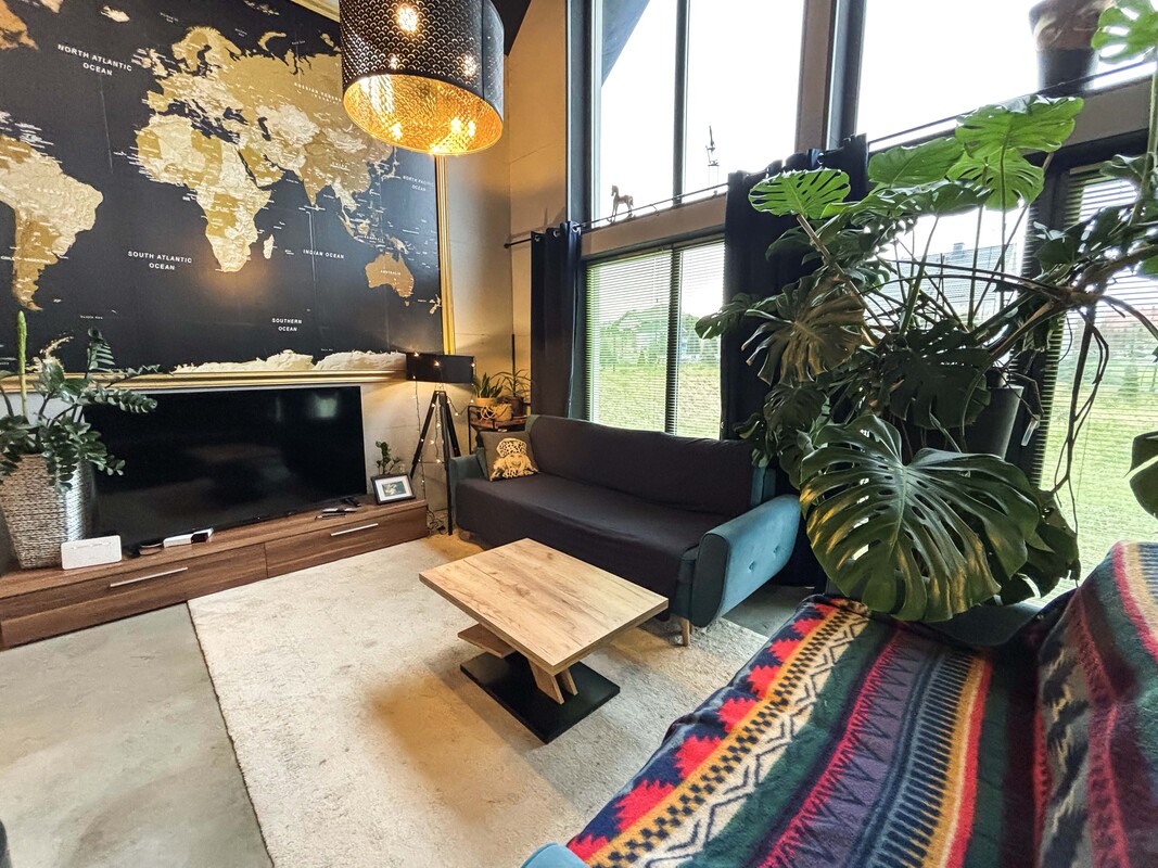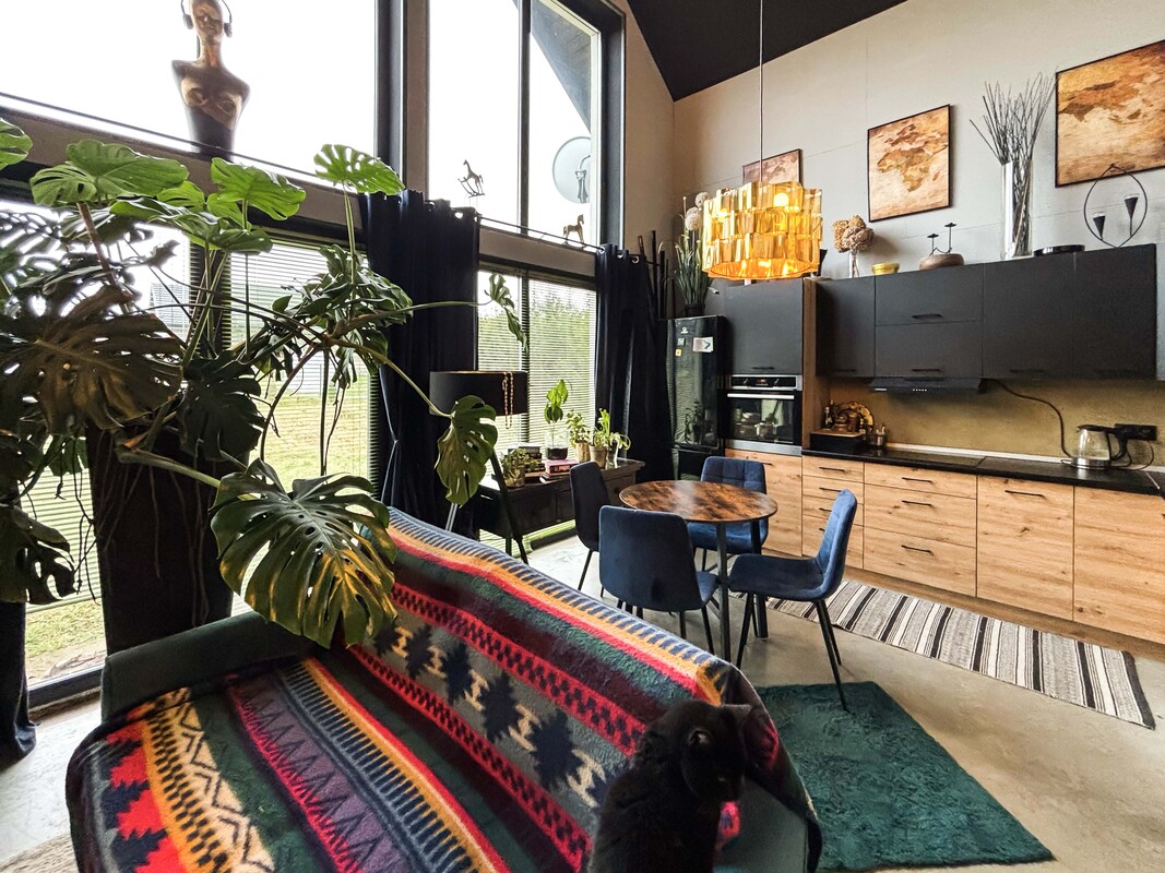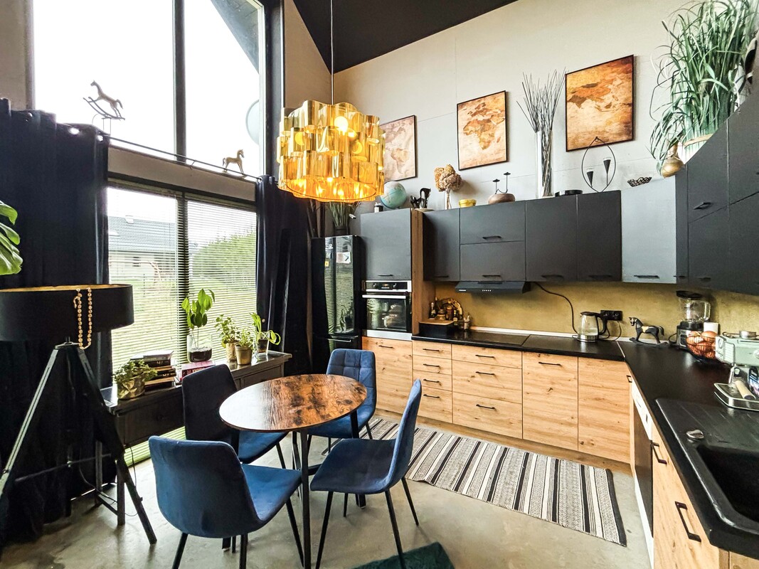 Na parterze znajduje się przestronny salon połączony z kuchnią i jadalnią, łazienka, sypialnia, pomieszczenie gospodarcze oraz hol. Piętro stanowi antresola z pięknym widokiem na przestrzeń dzienną dzięki dużym przeszkleniom, dwa pokoje z wyjściem na duży balkon z widokiem na łąki oraz łazienka. Dodatkowo w holu znajduje się wejście na strych z chowanymi schodami. Dom został zaprojektowany z myślą o komforcie, w części dziennej znajduje się kominek typu „ koza” , a ogrzewanie podłogowe na parterze i piętrze zasilane jest gazowym piecem dwufunkcyjnym z bojlerem. Nieruchomość posiada przydomową oczyszczalnię ścieków, co dodatkowo obniża koszty eksploatacji.