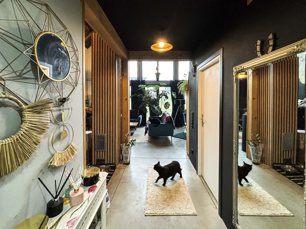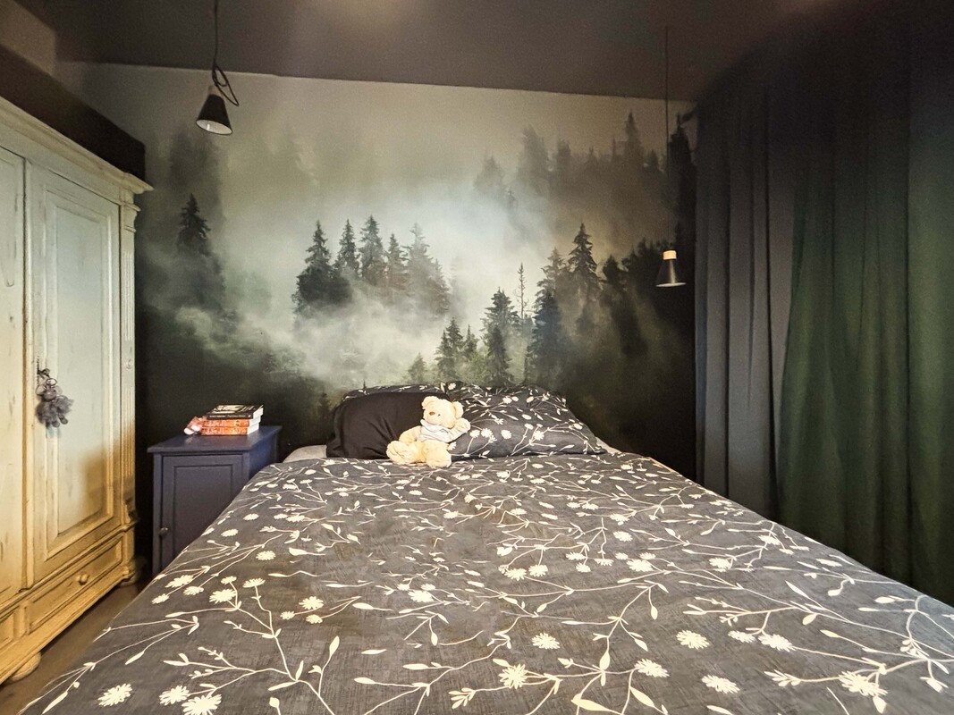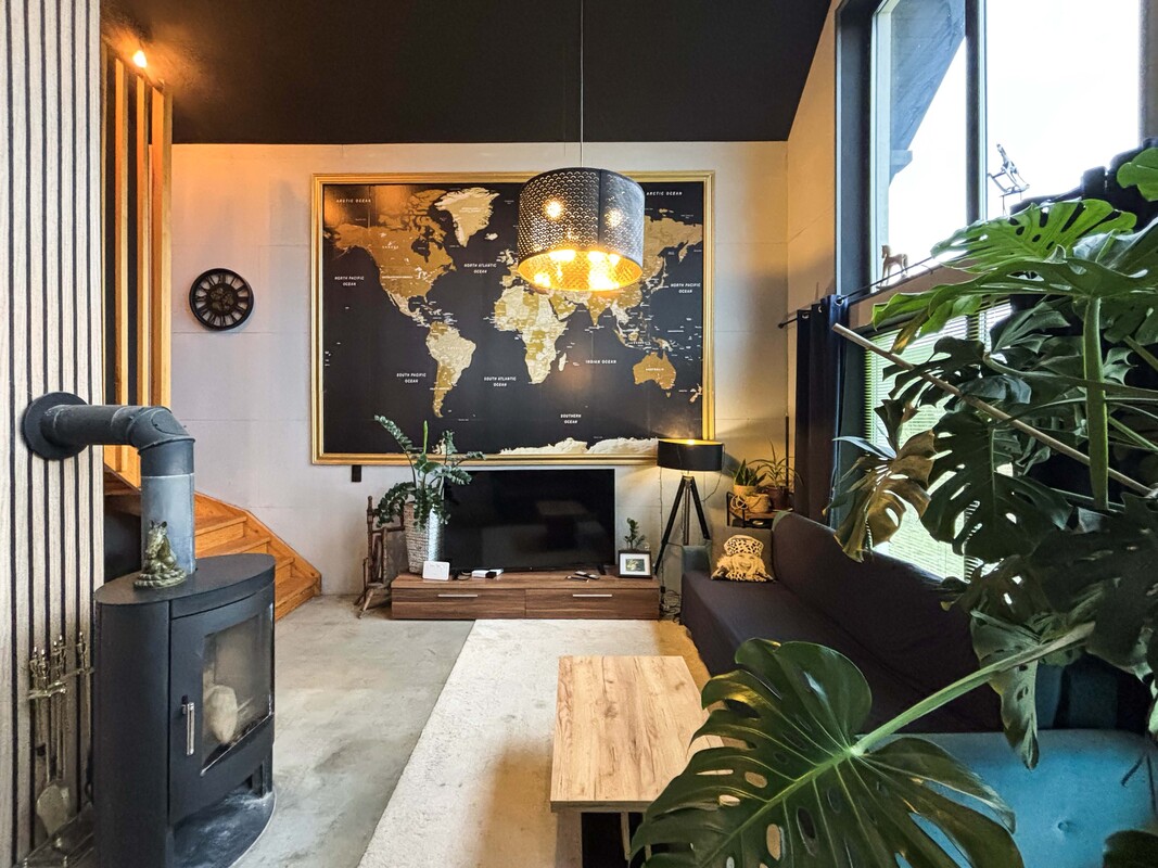 Na parterze znajduje się przestronny salon połączony z kuchnią i jadalnią, łazienka, sypialnia, pomieszczenie gospodarcze oraz hol. Piętro stanowi antresola z pięknym widokiem na przestrzeń dzienną dzięki dużym przeszkleniom, dwa pokoje z wyjściem na duży balkon z widokiem na łąki oraz łazienka. Dodatkowo w holu znajduje się wejście na strych z chowanymi schodami. Dom został zaprojektowany z myślą o komforcie, w części dziennej znajduje się kominek typu „ koza” , a ogrzewanie podłogowe na parterze i piętrze zasilane jest gazowym piecem dwufunkcyjnym z bojlerem. Nieruchomość posiada przydomową oczyszczalnię ścieków, co dodatkowo obniża koszty eksploatacji.