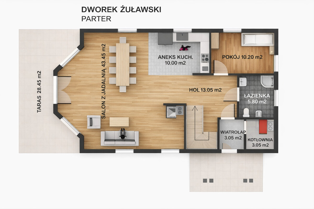 Dom drewniany Dworek Żuławski jest zgrabnym i przytulnym domem całorocznym o wymiarach 8,0 x 12,0m i powierzchni użytkowej 155,02m2.