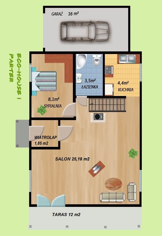 Dom drewniany Ecohouse I-z garażem jest zgrabnym i przytulnym domem całorocznym o wymiarach 6,1 x 8,6m +garaż 3,3 x 5,4m, i powierzchni użytkowej 66,40m2+ garaż 16,06m2.