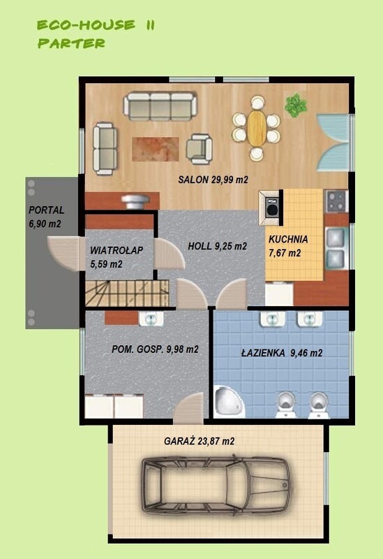 Dom drewniany Ecohouse II - z garażem jest zgrabnym i przytulnym domem całorocznym o wymiarach 7,8 x 10,8m + garaż 4,0 x 6,5m i powierzchni użytkowej 130,04m2+ garaż 23,87m2.