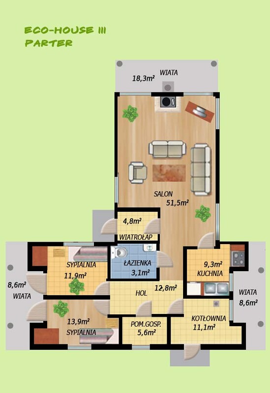 Dom drewniany Ecohouse III jest zgrabnym i przytulnym domem całorocznym o wymiarach 13,3x15,9m i powierzchni użytkowej 163,45m2.