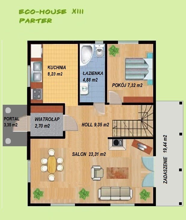 Na parterze znajduje się salon z kuchnią, pokój i łazienka. Natomiast na poddaszu dom posiada 3 sypialnie oraz drugą łazienkę. Układ ścianek działowych, wewnętrznych jest dowolny. Duża ilość okien sprawia, że do domu wpływa odpowiednia ilość promieni słonecznych