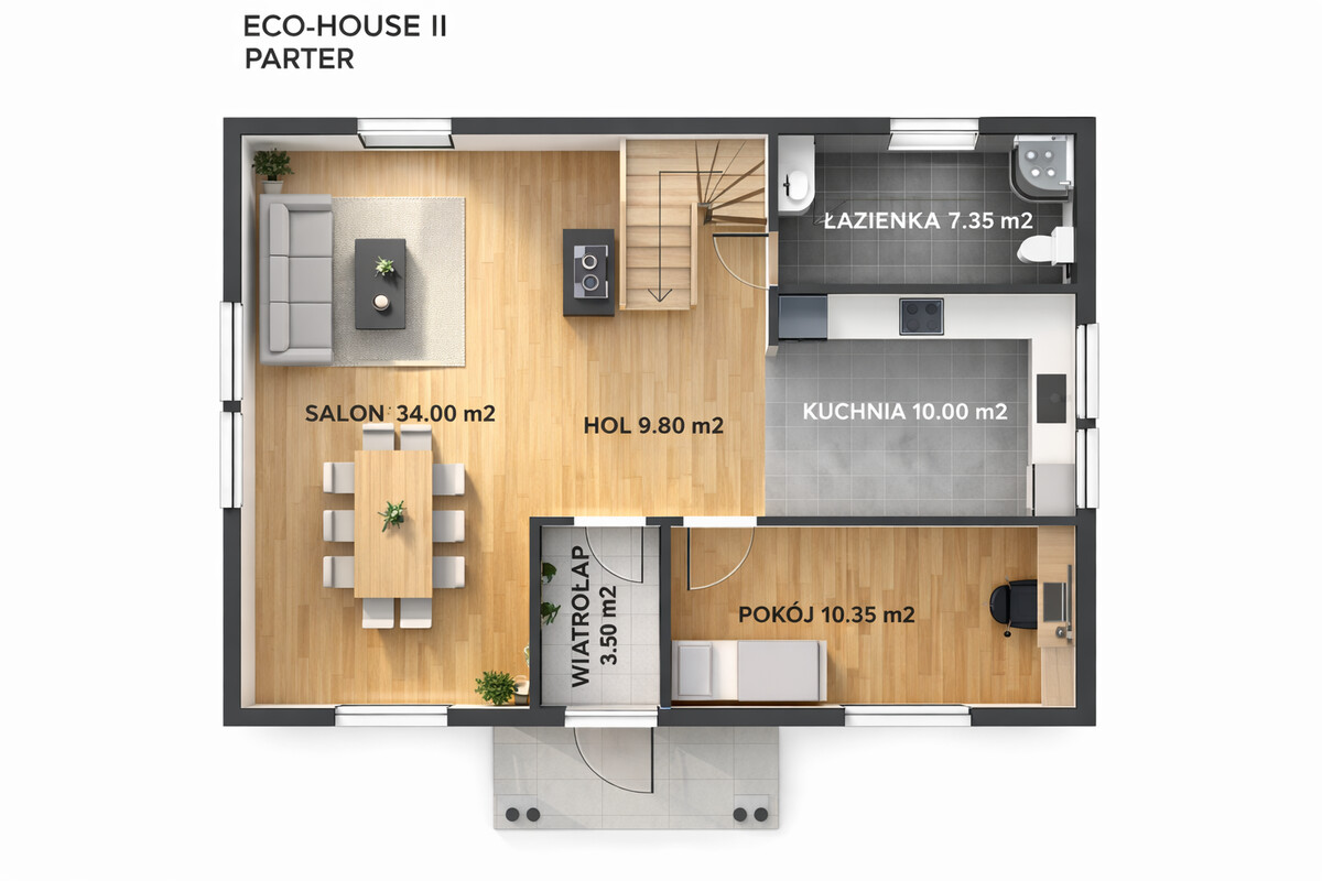 Dom drewniany Ecohouse II jest zgrabnym i przytulnym domem całorocznym o wymiarach 7,8 x 10,8m i powierzchni użytkowej 123,77m2.