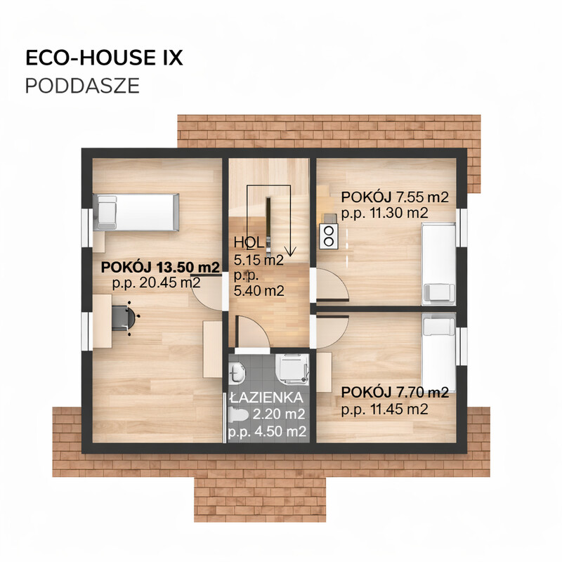 Dom drewniany Ecohouse IX jest zgrabnym i przytulnym domem całorocznym o wymiarach 7,0 x 9,0m i powierzchni użytkowej 91,62m2.