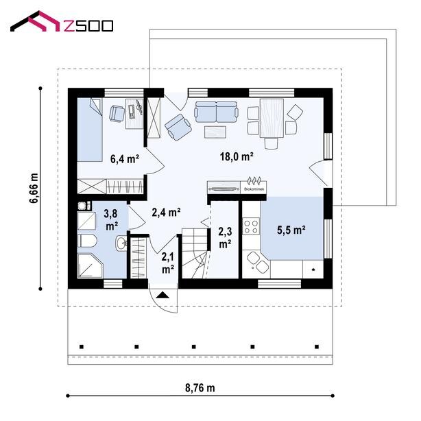 Dom drewniany Ecohouse Mini V jest zgrabnym i przytulnym domem całorocznym o wymiarach 6,6 x 8,7m i powierzchni użytkowej 63m2.