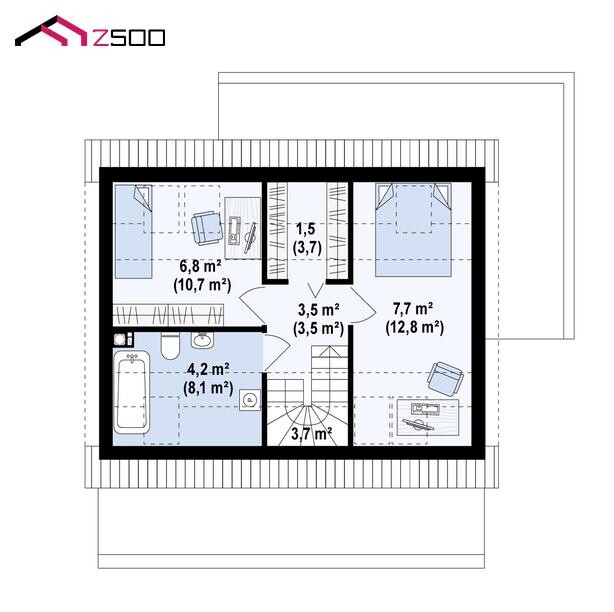 Na parterze znajduje się salon z kuchnią, gabinet i łazienka. Natomiast na poddaszu dom posiada 2 sypialnie oraz drugą łazienkę. Układ ścianek działowych, wewnętrznych jest dowolny. Duża ilość okien sprawia że do domu wpływa odpowiednia ilość promieni słonecznych