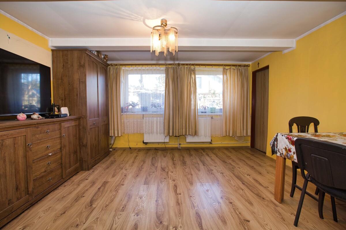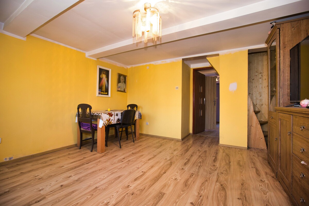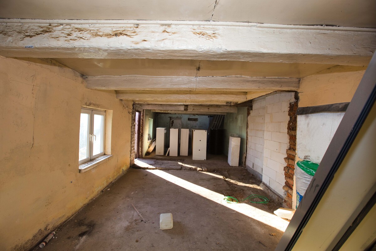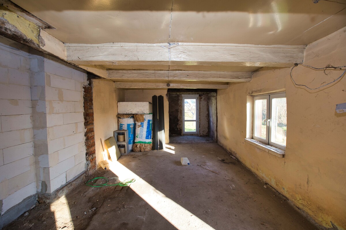 Jedna część budynku wymaga przeprowadzenia remontu, natomiast druga została przygotowana w formie otwartej przestrzeni – wnętrze pozbawione jest ścian działowych, co pozwala na swobodną aranżację i zaprojektowanie układu pomieszczeń według własnych potrzeb.