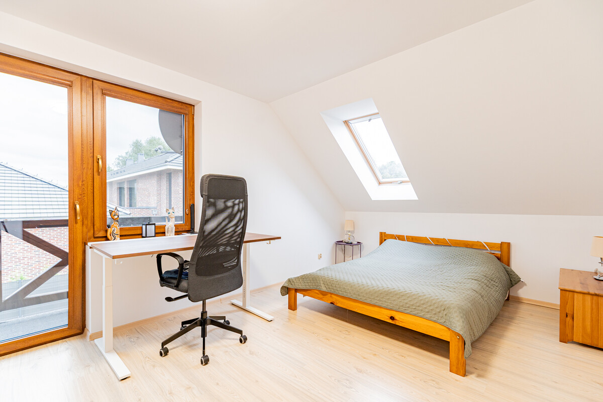 Na piętrze znajduje się komfortowa sypialnia główna z własnym balkonem o powierzchni 9 m² oraz prywatną łazienką wyposażoną w wannę. Dodatkowo do dyspozycji są dwie kolejne sypialnie – jedna z balkonem 6 m² – które świetnie sprawdzą się jako pokoje dziecięce lub gościnne. Na tym poziomie mieści się także dodatkowa łazienka z prysznicem i WC oraz miejsce na garderobę.