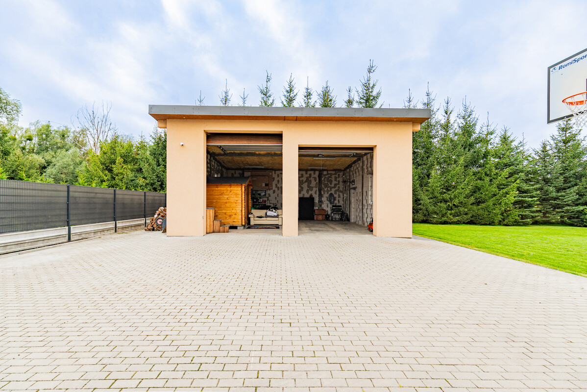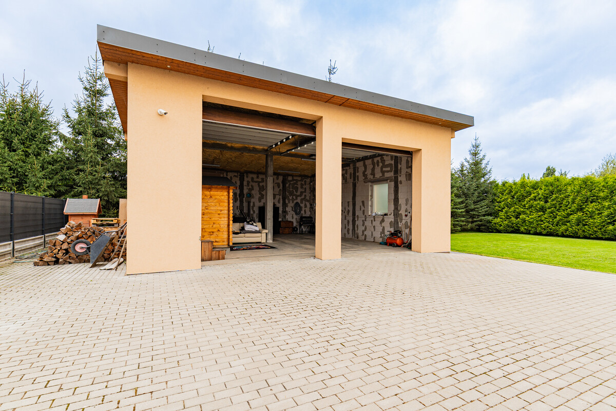 Na posesji znajduje się także duży, ogrzewany budynek o powierzchni 90 m², w pełni uzbrojony w media – wodę, prąd oraz kanalizację. Posiada bramę na pilota i okna PCV. Obiekt ten może służyć jako garaż dla pojazdów ciężkich, magazyn lub – po adaptacji – niezależne mieszkanie. Dojazd do niego został specjalnie utwardzony, co umożliwia wjazd i parkowanie maszyn budowlanych czy pojazdów ciężkich.