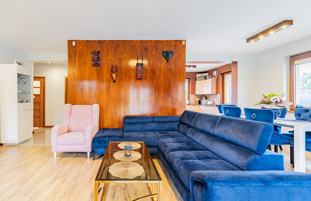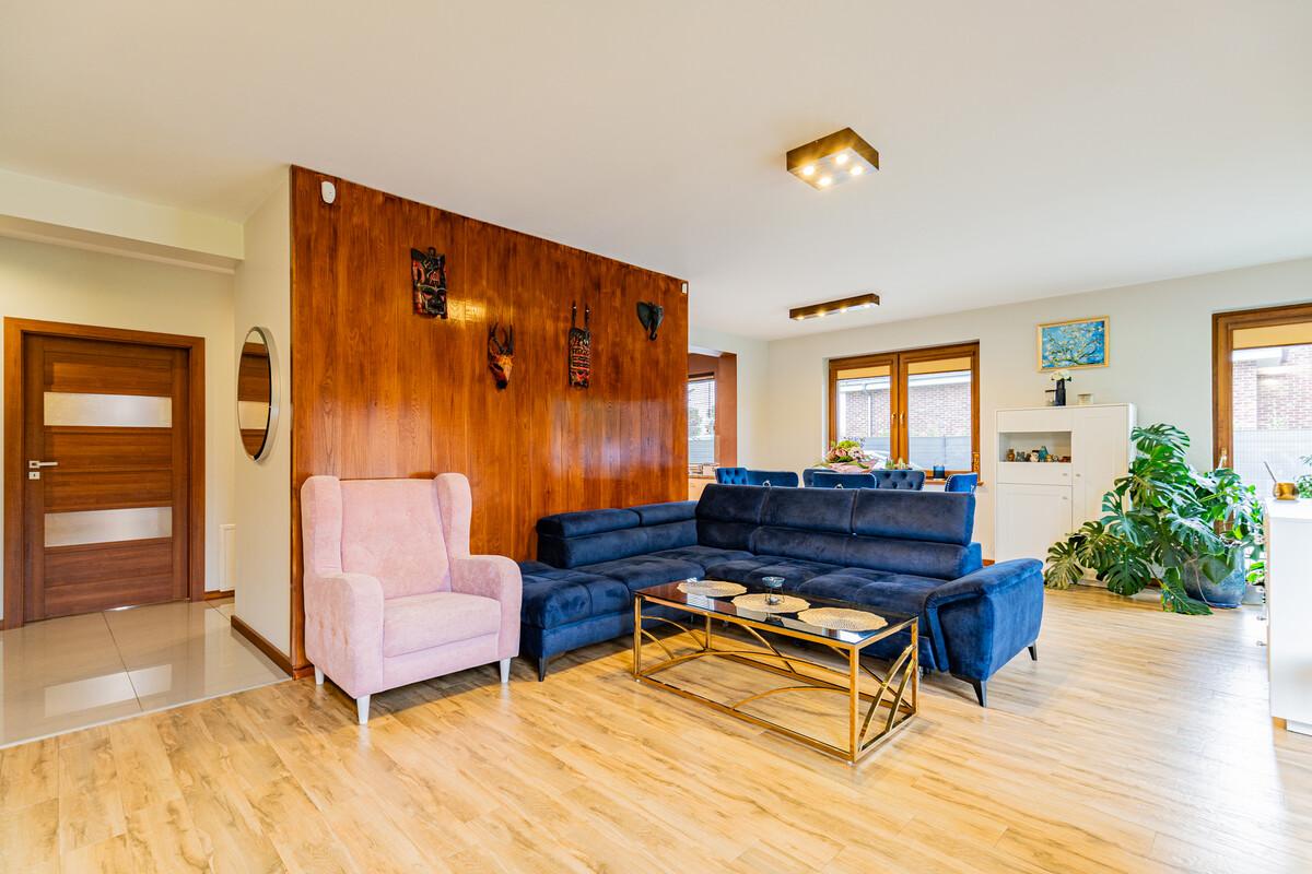 - Przestronny, jasny salon z wyjściem na taras i widokiem na ogród,