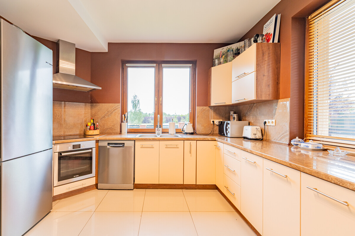 - Kuchnia z meblami na wymiar i pełnym wyposażeniem AGD,