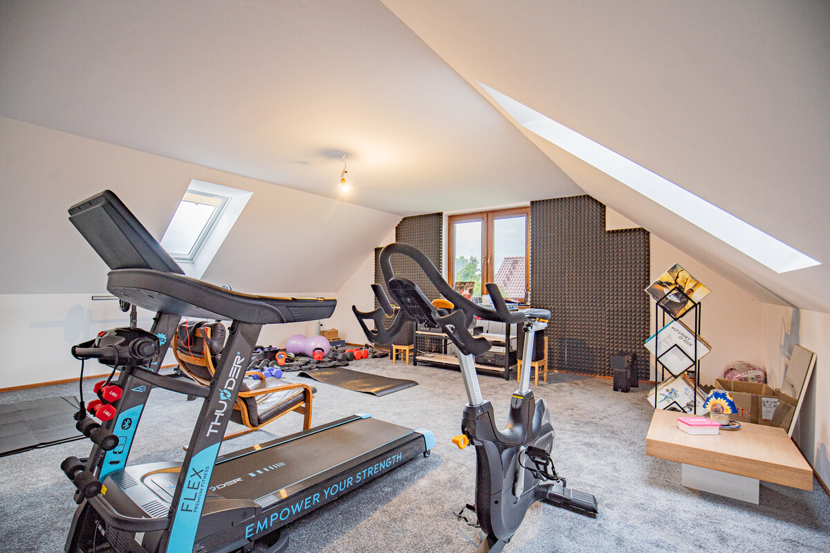- Dodatkowy duży pokój na półpiętrze (ponad 30 m²) – obecnie siłownia, z możliwością dowolnej aranżacji,