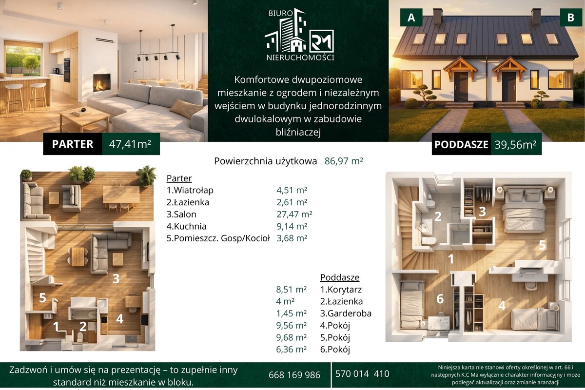 Każdy lokal to 86,97 m², jasny salon z wyjściem do ogrodu, 3 sypialnie, 2 łazienki, ogrzewanie podłogowe, pompa ciepła i rekuperacja. Do tego ogrodzona działka i podjazd na dwa auta.
