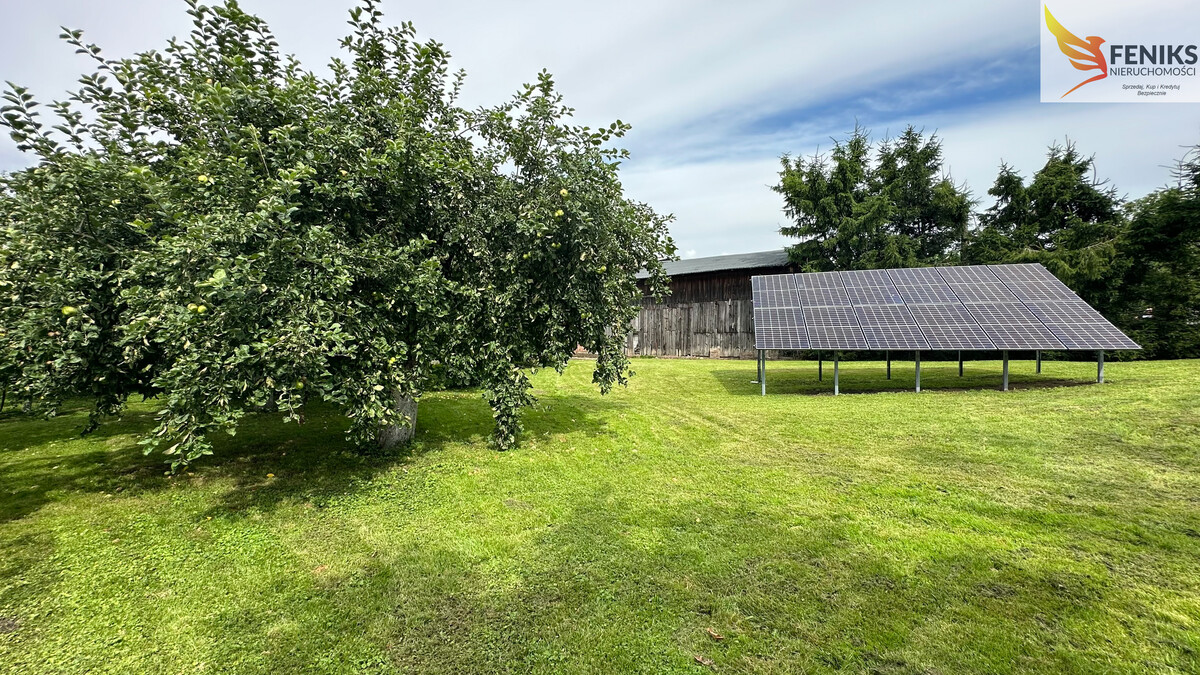 Druga działka która graniczy z pierwszą - nie jest zabudowana, umieszczono na niej fotowoltaikę 4,5 Kw, która zasila budynki gospodarcze i dom. W tym miejscu znajduje się mały sad z drzewami owocowymi jabłka, gruszki, czereśnie, nieopodal znajduje się ogród warzywny. Jest możliwość dokupienia ziemi ornej, która również graniczy z siedliskiem ale ta część nieruchomości nie jest ujęta w cenie.