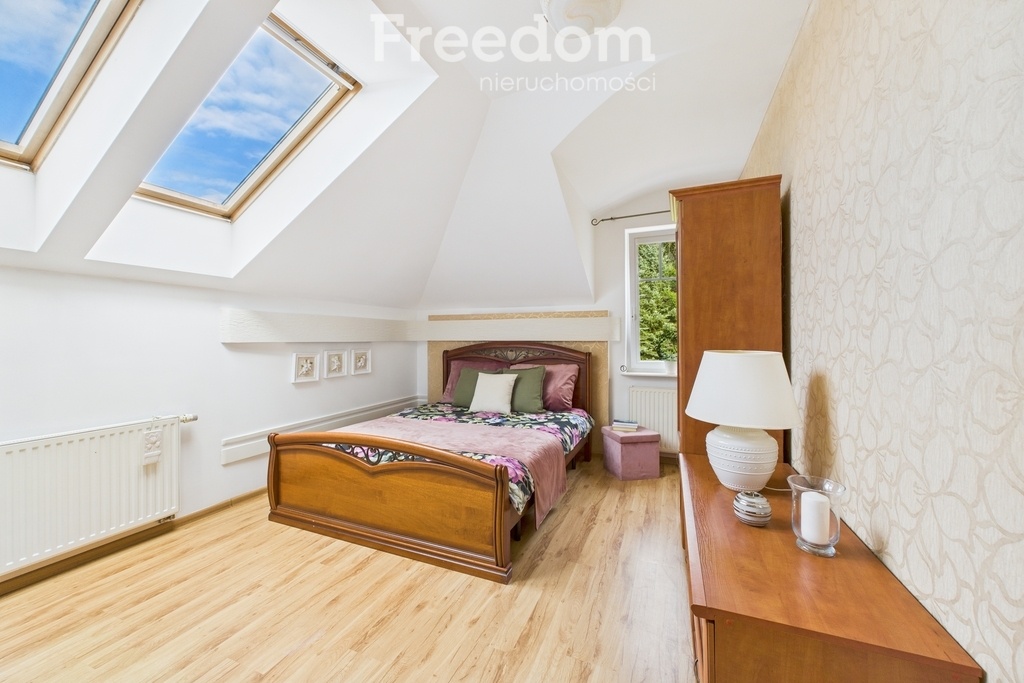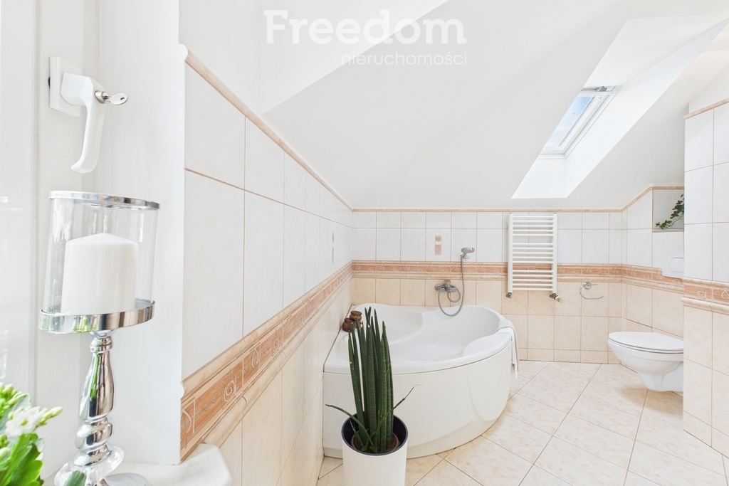 Na piętrze mamy trzy przestronne sypialnie, zapewniające komfort prywatności każdemu z mieszkańców. Łazienka na górze wyposażona jest w wannę oraz okno, co pozwala cieszyć się pełnią wygody i naturalnym światłem.