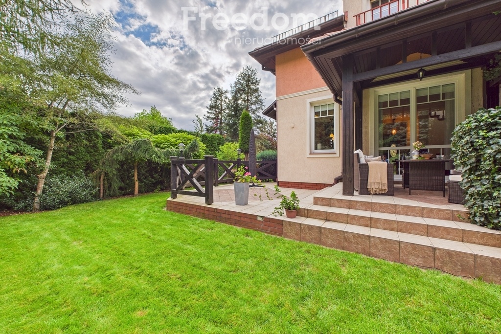 The property sits on an 890 m² plot, designed and maintained by experienced gardeners, and its layout ensures both privacy and an aesthetically pleasing, harmonious appearance. The garden boasts a rich vegetation, including numerous flowers, ornamental trees, and a well-maintained lawn with a pond.