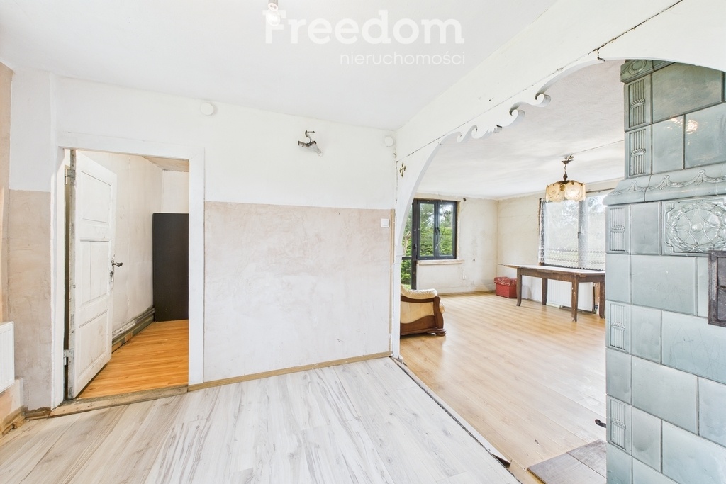 Budynek ma 5 pokoi, oddzielną, widną kuchnię oraz 1 łazienkę. Układ pomieszczeń pozwala na wygodne życie rodziny lub stworzenie funkcjonalnej przestrzeni pod wynajem lub działalność. Dom wymaga lekkiego remontu, co daje możliwość dostosowania wnętrz do własnych potrzeb i gustu.