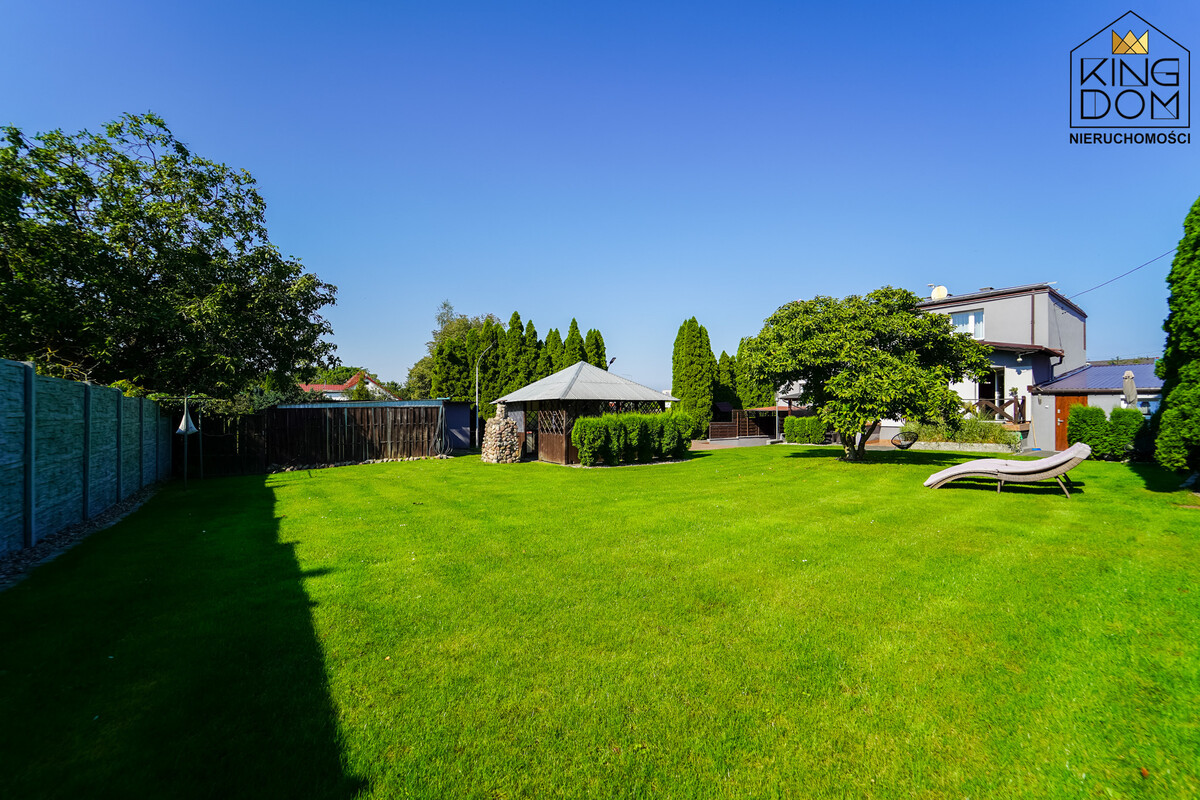 Działka o powierzchni 1200 m2 została starannie zagospodarowana, obsadzona licznymi drzewami i krzewami ozdobnymi, z utwardzonym podjazdem wyłożonym kostką brukową. Oprócz garażu w bryle domu do dyspozycji pozostają trzy wolnostojące garaże, które mogą pełnić funkcję dodatkowych miejsc parkingowych bądź praktycznego zaplecza do przechowywania narzędzi, sprzętu ogrodowego czy rowerów.